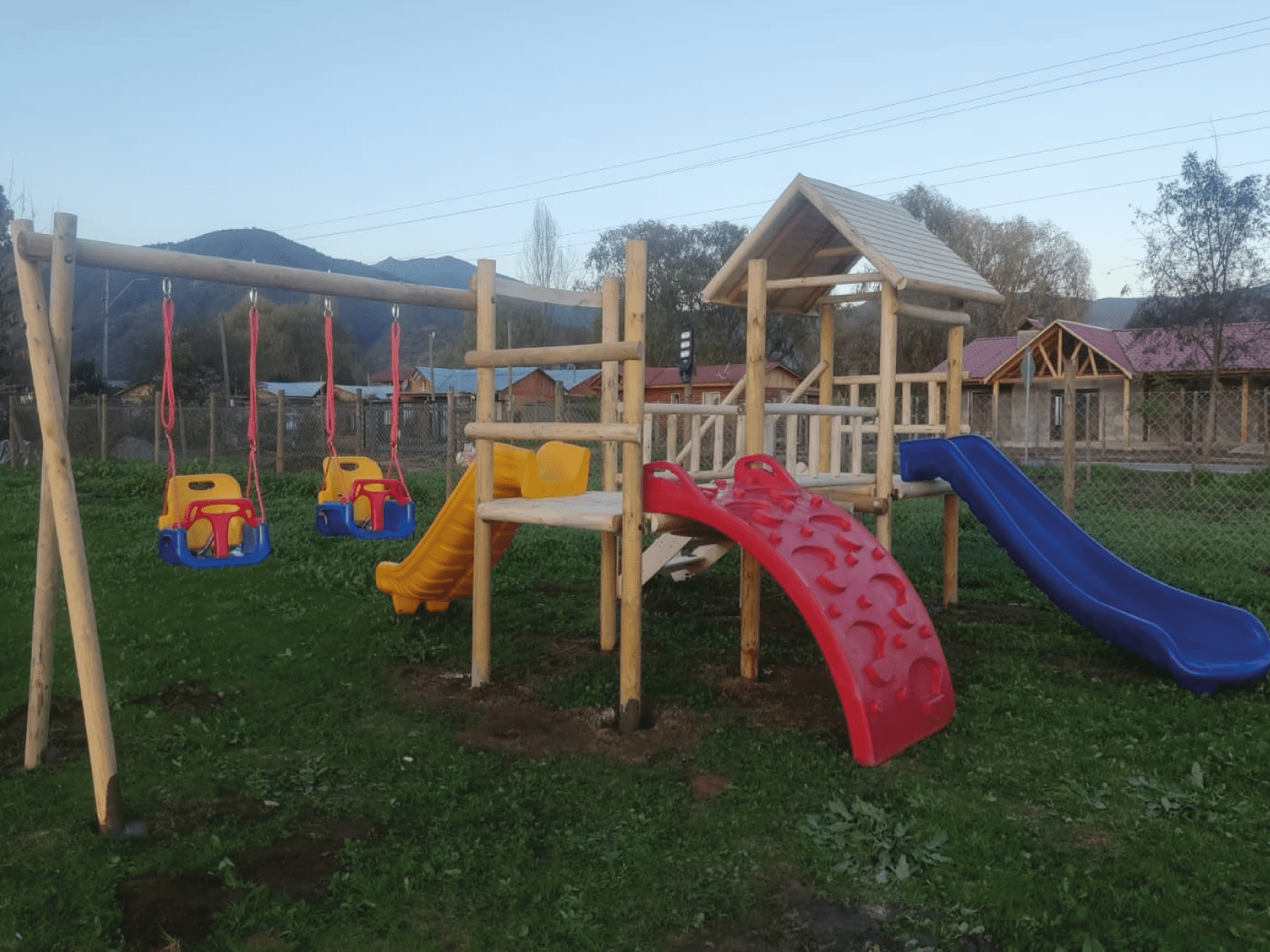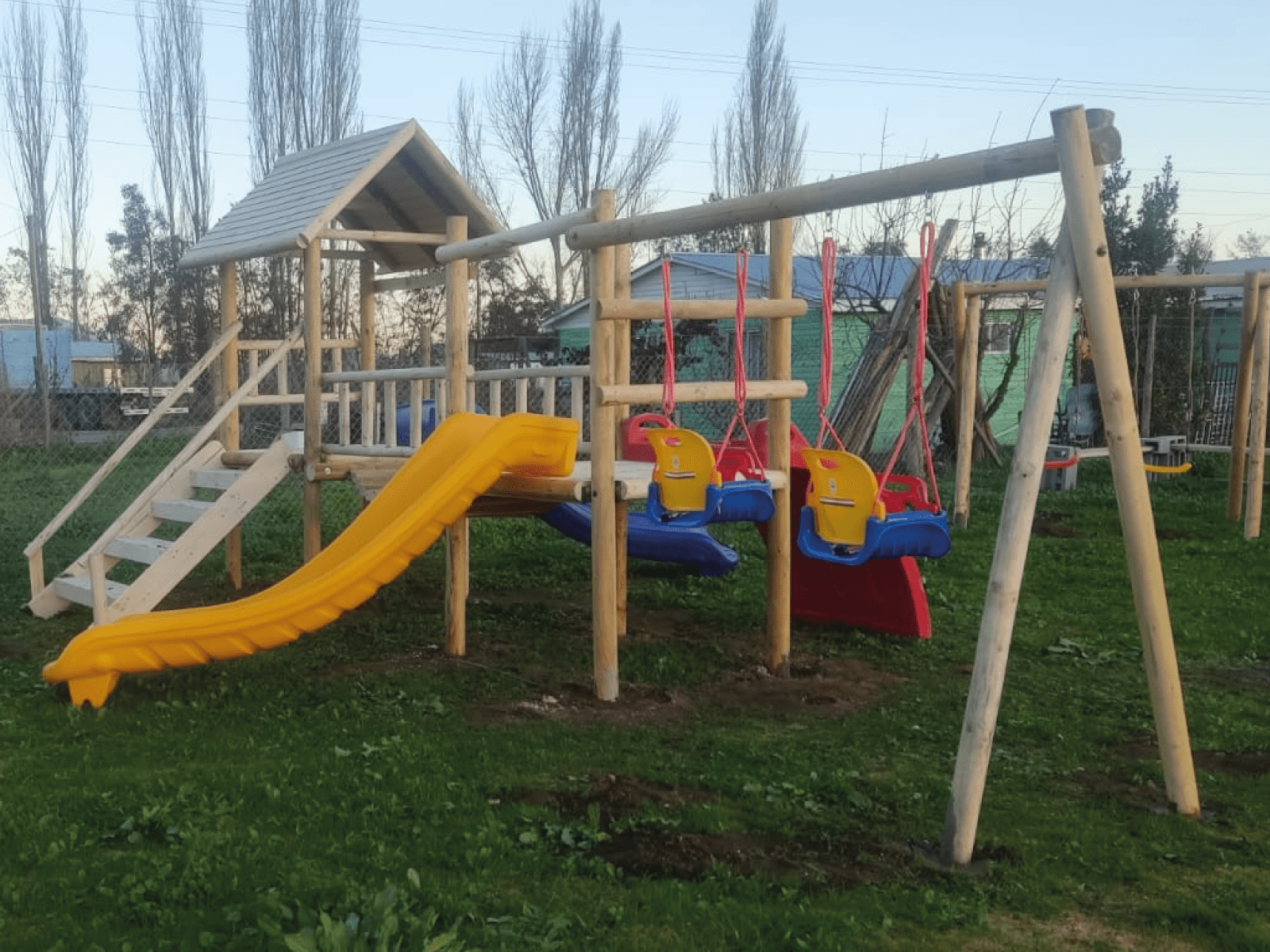 La estructura del Modelo Las Cabras está compuesta por madera sólida impregnada, tratada específicamente para resistir la humedad, los hongos y el ataque de insectos. Los componentes plásticos cuentan con protección UV, lo que asegura que los colores de los resbalines y accesorios se mantengan brillantes a pesar de la exposición constante al sol.