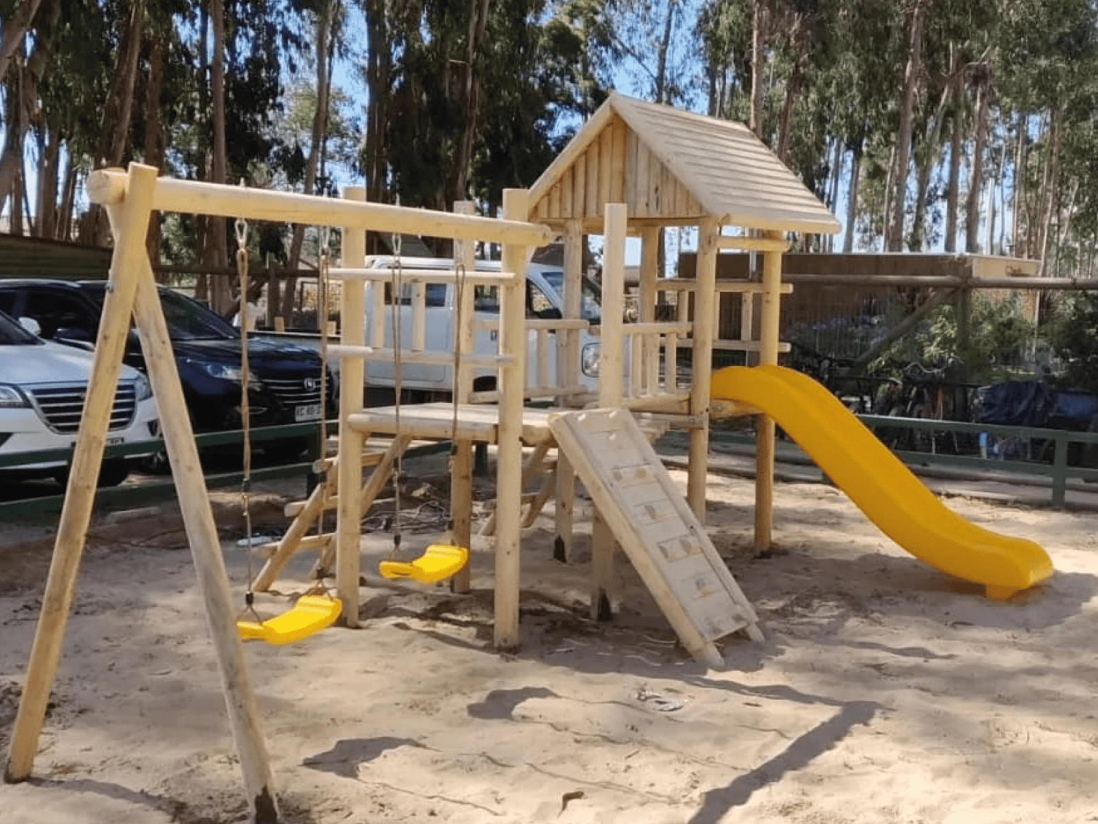 Viga de Columpios: Una estructura lateral de postes cilíndricos sostiene dos asientos de columpio, proporcionando el balanceo clásico que todos los niños disfrutan.