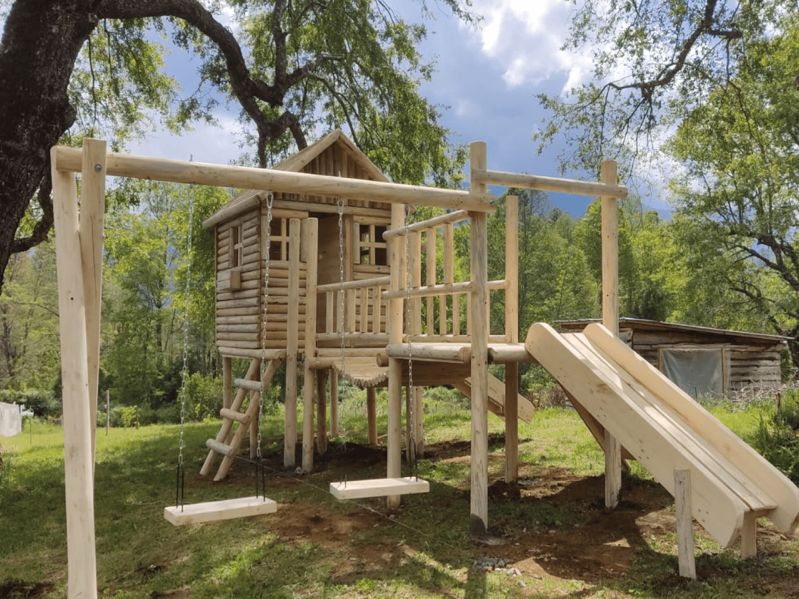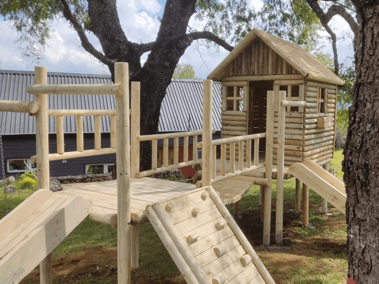 | Texto Alternativo (Alt) | Haz clic en la foto y escribe: Plaza de juegos de madera Pucón con casa elevada y columpios. |